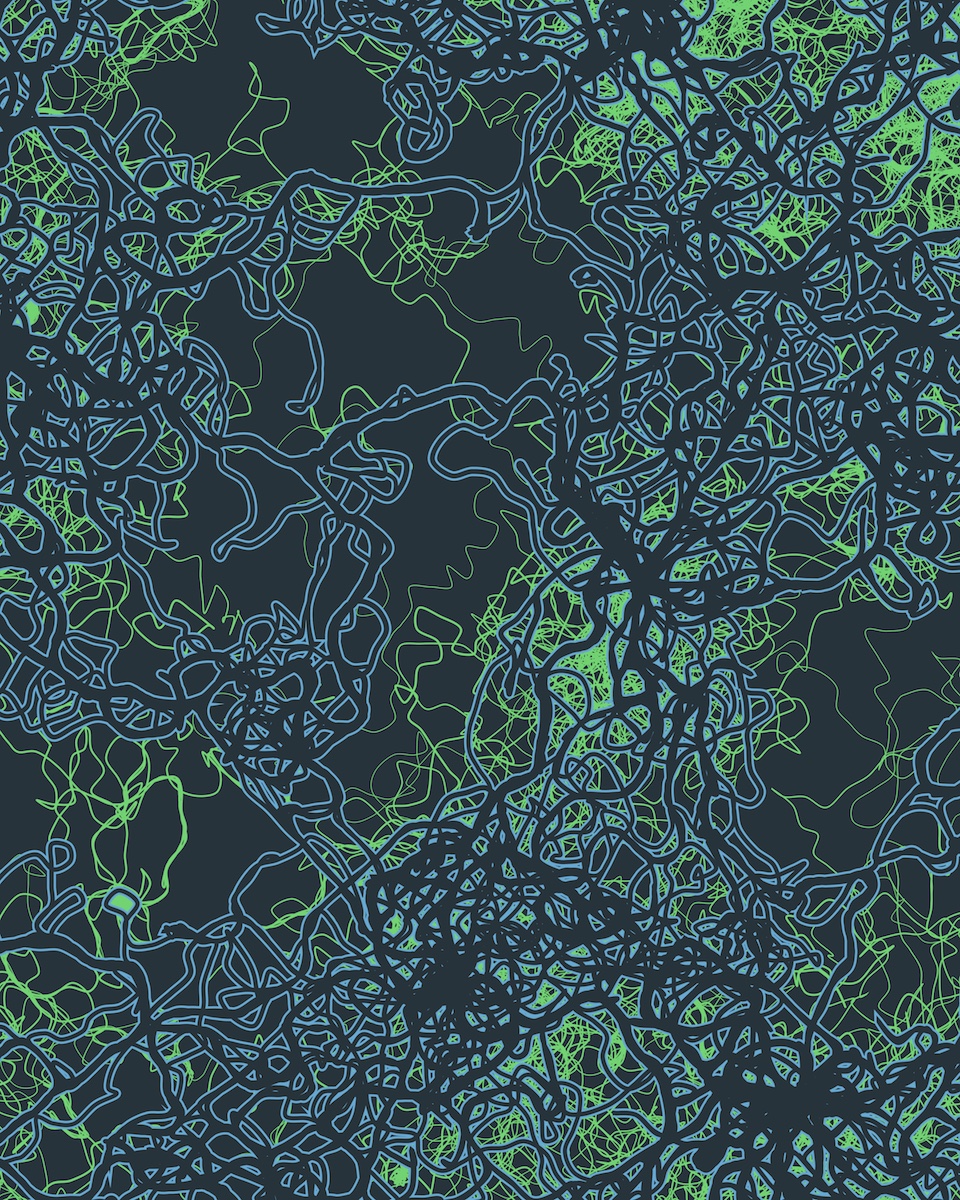 An example of vector output. You can see the individual ant paths here. Where many ants traveled, the slightly overlapping lines make thicker paths.